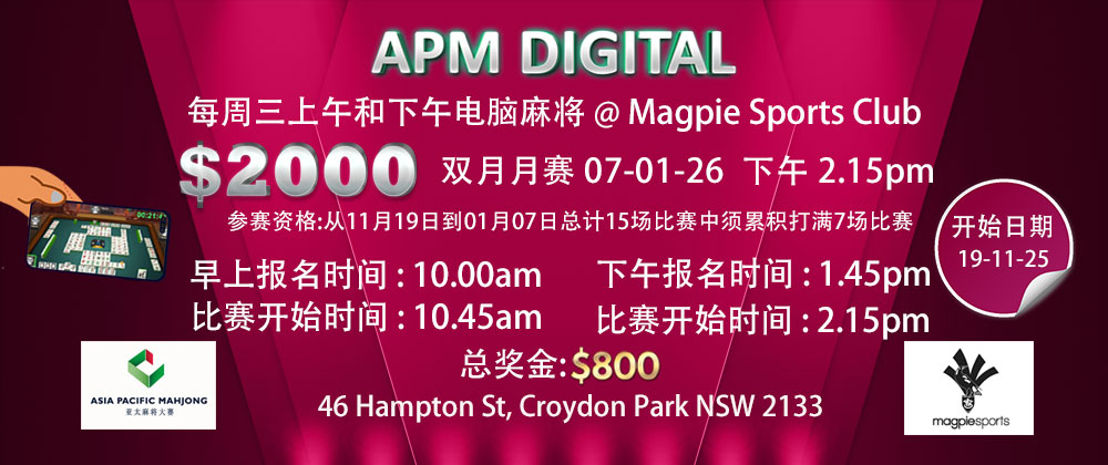 请注意,已获得 2020 年冬季麻将锦标赛门票并且不希望再参加2023年 APM Digital新年锦标赛的会员,请在 2022 年 11 月 15 日前通知我们的赛事工作人员,以便安排为您于 2022 年 12 月 3 日星期六在 Canterbury Hurlstone Park RSL 领取现金退款。而选择继续参赛的会员将争夺至少 $10,000 的现金大赛奖励,有机会成为 2023年中国新年麻将大赛(2020 年冬季麻将锦标赛)的冠军。